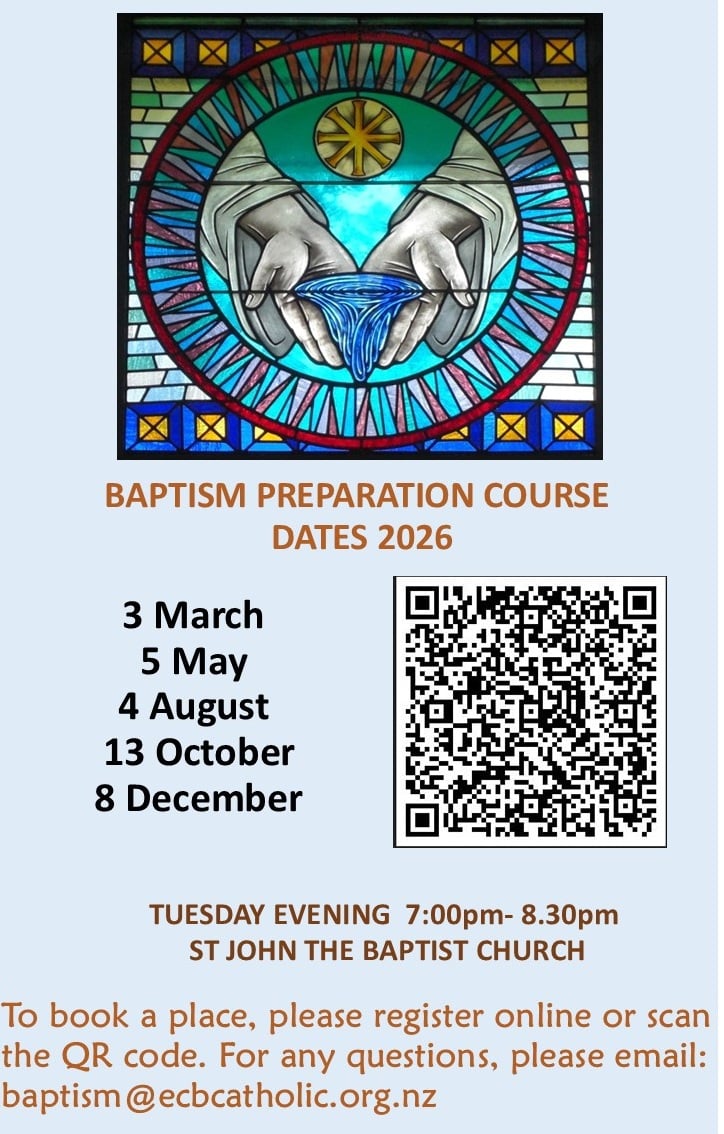 Please note the change of date: The next Baptism Preparation Course is scheduled for Tuesday, 03 March 2026 at 7pm.
